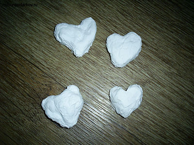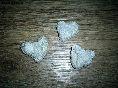 Теперь из нашей бумажной массы лепим поделки. У нас получились вот такие сердечки. Оставляем их сохнуть при комнатной температуре или лучше на батарее. Не пугайтесь, что вид изделий не слишком привлекательный. В процессе дальнейшей доработки сердечки станут более ровными.
