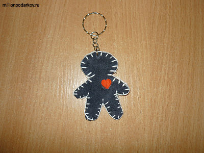 Приступаем к креплению цепочки для брелка. Прокалываем шилом отверстие в верхней части человечка. Затем разжимаем одно из колец цепочки и продеваем его в человечка. После этого кольцо зажимается плоскогубцами. Брелочек из замши готов!