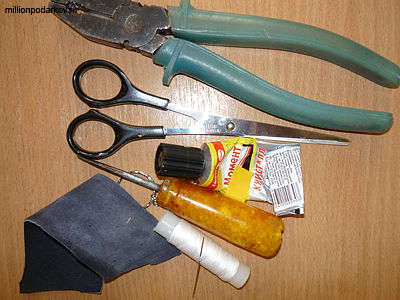 Для поделки из замши "Брелок" вам потребуется кусочек замши, нитки, иголка, ножницы, клей "Момент", шило, плоскогубцы, цепочка для брелка с колечком, маленькое сердечко.