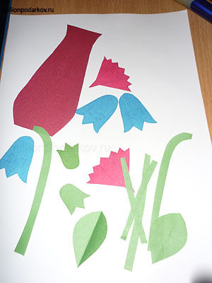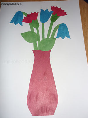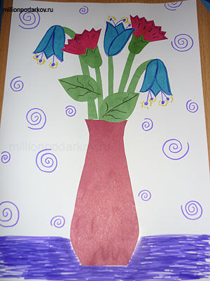 Такие поделки к 8 марта из бумаги "Открытка", можно сделать в детском саду, в подарок мамам. Воспитателю необходимо заранее выстричь из бумаги все детали для открытки, а затем проконтролировать то, как ребенок будет приклеивать их к листу. А в завершении работы обвести контуры цветов и нарисовать стол.