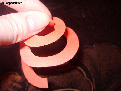 Вырезаем несколько кружочков из красной бумаги. Их нужно столько, сколько вы хотите сделать розочек. Затем каждый кружочек разрезаем по спиральке, получаем спиралевидную ленточку.