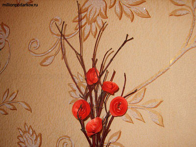 Выбираем место для розочек и закрепляем их на этом месте. Это можно сделать так: надевайте цветок на маленький отросток веточки и закрепите клеем, смазав место соединения. Поделка к 8 марта своими руками готова, можете дарить.