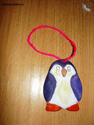 Раскрашиваем поделку и вставляем нитку в отверстие. Вот и подошла к концу лепка поделки к Новому году из теста "Пингвин на ёлку".