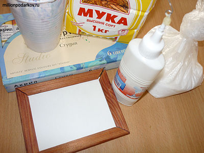 Для поделки "Панно с бабочкой" вам потребуется мука, соль "Экстра", вода, краски акриловые, рамка для фото, клей ПВА, открытка с цветами.