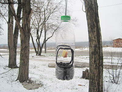 Зимой мы так любим наблюдать за синичками, подкармливать их зерном. Почему бы не сделать для них кормушку? Поделки кормушки легко сделать из пластиковой бутылки. Можно повесить кормушку на балконе , за окном. А можно повесить такую кормушку во дворе и всем двором подкармливать птиц. Не забудьте подкладывать в поделки кормушки кроме семян и кусочки сала - зимой птичкам не хватает жиров.