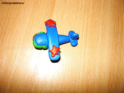 Лепим из красного пластилина звездочки и украшаем ими крылья самолета. Затем делаем самолету лобовую часть кабины. Детская поделка готова!