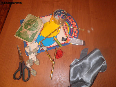 Чтобы сделать поделки на 8 Марта нужно взять лоскут красивой ткани, элементы декора, например, вязаный цветочек, листики из плотного материала, лавровый лист, клей и нитки