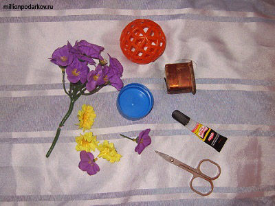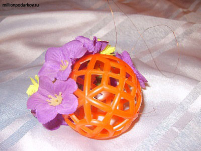 Ножки у отрезанных цветков обматываем проволокой и присоединяем цветы к пластмассовому мячику. Постепенно закрываем весь мячик цветами.