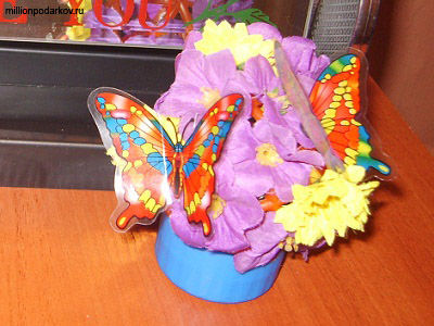 Завершающий этап изготовления поделки на 8 марта своими руками состоит в приклеивании подставки. Подставкой у нас является колпачок. Затем композицию украсьте бабочками. Все, поделка готова.
