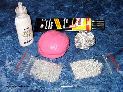 Для начала нужно замесить соленое тесто и подкрасить его розовой гуашью. Из фольги скатать плотный шарик нужного размера. Так же необходимо приготовить булавку, бисер и клей.