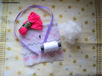 Пришейте бусинки на место глаз. Розовой ниткой вышейте носик. Повяжите на шею бантик.Сделанные поделки на уроках труда послужат прекрасным подарком на новый год для родственников.