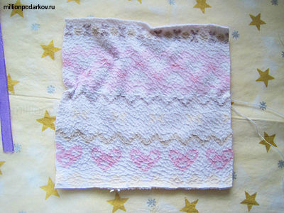 Выкроите ровный квадрат из флиса. Наметочным швом прошейте деталь треугольником так, как показано на фото.Концы нитки не закрепляем. Треугольник нижней плоскостью делит квадратную выкройку пополам, а верхний угол находится в центре верхней плоскости квадрата.