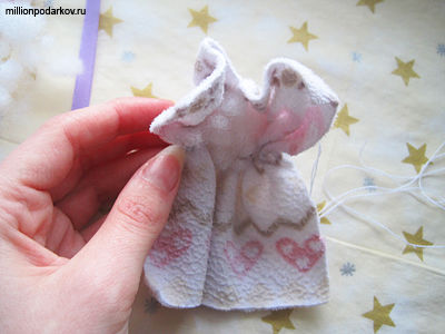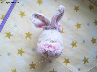 Оба конца нитки стягиваем и набиваем деталь наполнителем. Закрепляем нитку.У нас получилась голова и ушки.