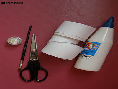 Для поделки объемной из бумажной ленты понадобиться ленточная бумага, клей, кисть, ножницы, блесточки