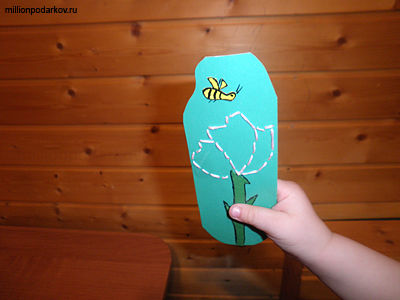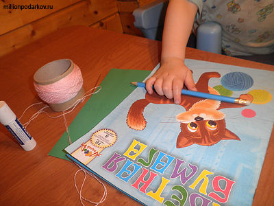 Из желтой бумаги вырезаем маленькую пчелку, которую тоже наклеит ваш помощник. Поделка с детьми из ниток может стать и красивой закладкой для любимой книги.