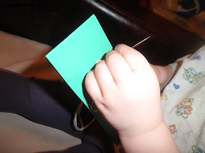 Прокалываем иглой в нужном месте лист картона, а ребенку предлагаем помочь вытянуть. Этот процесс очень заинтересует малыша. Таким образом, вышиваем сам цветок.