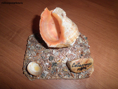 Из картона вырезаем небольшую картонку и наклеиваем на нее мелкие камешки, в центральную часть приклеиваем самую большую ракушку и камень.