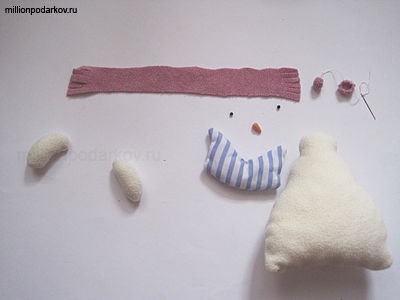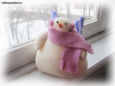 Пришейте ручки, наушники. Пришейте глазки. Приклейте носик и накиньте шарфик. Нижние уголки тельца вдавите внутрь, тогда получиться округлый низ поделки снеговика.