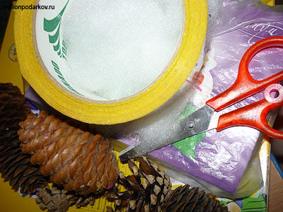 Для изготовления поделки сказочных героев из шишек, приготовьте еловые шишки, синтепон, коробку от сухих завтраков, пластилин, ножницы, 4 палочки для еды, скотч.