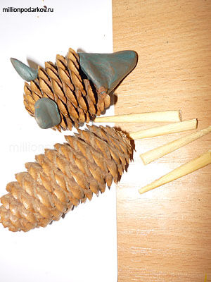 Делаем волку голову. Для этого ломаем одну еловую шишку и приклеиваем к ней пластилин. Затем ломаем палочки для еды это будут ноги.
