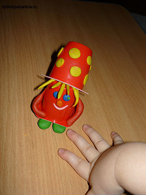 Переворачиваем стаканчик от растишки. Лепим из пластилина глазки, носик, ротик, ручки, ножки, и волосики. Приклеиваем всё это к стаканчику от растишки.