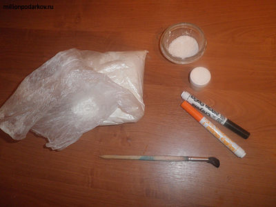 Для того, чтобы делать в качестве поделки снеговиков, нужно подготовить материал. Предлагаю сделать соленое тесто. Для возьмем 1/4 часть воды, 2/3 соли и муки. Подговм белую гуашь, черный и оранжевый фломастеры.
