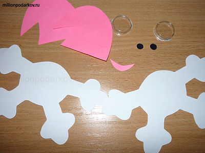 Вырезаем из бумаги детали для нашей поделки. делаем по 2 детали тела снежинки и колпачка. Из кластера от таблеток и черной бумаги делаем основу для глазок, из розовой бумаги вырезаем ротик.