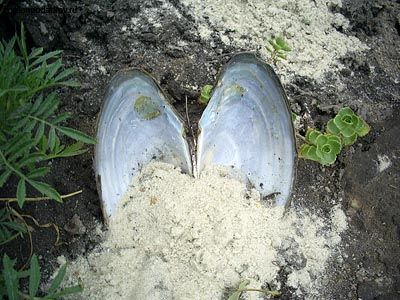 Для изготовления композиции подготовьте двустворчатые ракушки. Их Вы сможете найти на берегу реки. Ни в коем случае не вылавливайте живых моллюсков – воспользуйтесь тем, что найдете на суше. С помощью ножниц раскройте сворки или подберите две похожие половинки ракушки. Вкопайте их в землю и немного присыпьте песком. Вот что получилось у нас в итоге.
