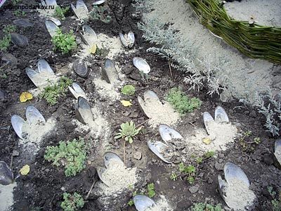 Теперь можно сделать целую «речную» композицию. Для этого вкопайте десяток-другой пар таких вот ракушек. Смотрите, насколько интересно и необычно смотрится подобная поделка!