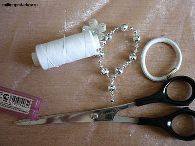 Для поделки своими руками из ткани вам потребуются: тафта, декоративные элементы (бусины, цветочек), резинка для волос, ножницы, зажигалка, нитки с иголкой.