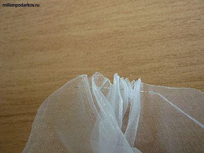 Обжигаем круг огнём, чтобы не обсыпалась ткань. Затем наживуливаем края круга на нитку с иголкой.