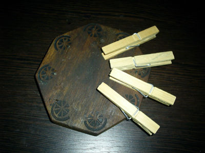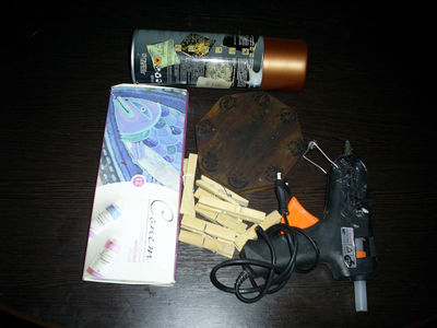 Для изготовления поделки нам понадобится деревянная подставка под горячее, прищепки, горячий силиконовый клей-пистолет, акриловые краски и аэрозольная краска бронзового цвета. Наша подставка под горячее уже «знала виды». Но это не мешает ей обрести новую жизнь.