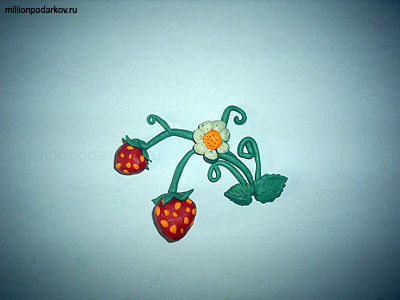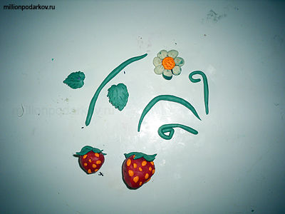 Из красного и оранжевого пластилина делаем ягоды клубники с зернами. Из зеленого материала делаем стебли с листочками и усики. Из белого и оранжевого пластилина слепим цветочек.