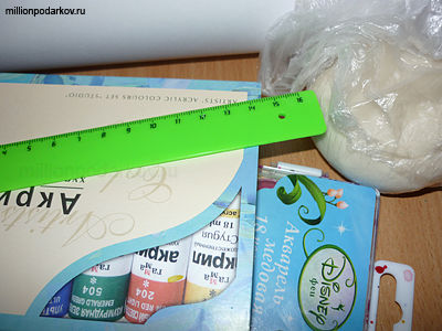 Для этой поделки нам потребуется лист ватмана, карандаш, ластик, акварель, стаканчик с водой, кисть, акриловые краски и солёное тесто.