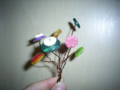 Разрезаем проволоку на кусочки. Продеваем ее через отверстия в пуговицах и закручиваем два свободных проволочных конца по спирали. Подобным образом делаем несколько цветочков и соединяем их вместе.