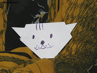 Завершаем работу над нашими простыми поделками из бумаги нарисовав мордочку нашему получившемуся котику