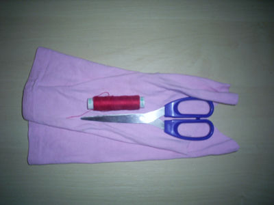 Для изготовления поделки нам понадобится кусок рукава от старой детской кофты, кусочек синтепона или ваты, ножницы и нитки. Если вы берете обычный лоскут ткани, то сшейте его так, что получился цилиндр.