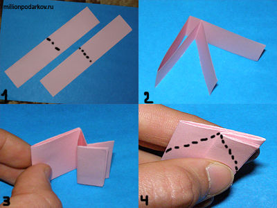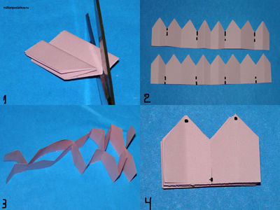 С помощью ножниц отрезаем от заготовки углы (см.фото1) с другой полоской проделываем тоже самое.После того как мы получили необходимые заготовки делаем надрез (см. фото2), после выполнения надрезов сложим наши заготовки разрез в разрез змейкой (см.фото3), и соберём вместе как на фото 4 (чёрными точками отмечено где наносить капли клея).