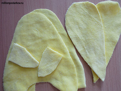 Для поделки из ткани "Зайка Кирюша" вам потребуется велюр желтого цвета, ножницы, нитки, иголка, синтепон, небольшой кусочек ткани для носика. Сложите ткань в четверо, затем вырежьте из неё округлую трапецию, в широкой части трапеции сделайте углубление. Когда развернёте у вас получится 2 детали тельца нашего зайки. Затем вырежьте из ткани сложенной вчетверо овалы и небольшие прямоугольники, это будут уши и верхние лапки.