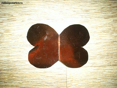 Из металлизированной цветной бумаги вырезаем крылья. Для этого прямоугольник складываем пополам, рисуем половинку детали, вырезаем, разворачиваем. Вот что получается в итоге.