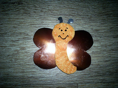 С помощью термопистолета приклеиваем туловище к крыльям. Рисуем черным маркером глаза, нос, рот, бровки, вырезаем из черного картона усики и приклеиваем их. Вот такая забавная бабочка у нас получилась в итоге.
