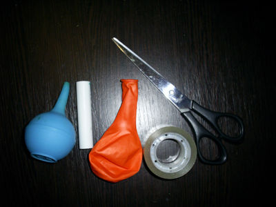 Для изготовления поделки следует подготовить пустую трубочку от ниток, лопнувший воздушный шарик, ножницы, скотч, клизму.