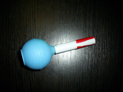 В другом конце трубочки закрепите клизму небольшого размера. Когда Вы будете нажимать ее, воздух, проходя через катушку, будет попадать в дырочку и результатом станет резкий звук.