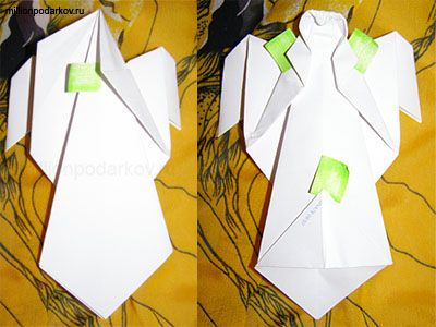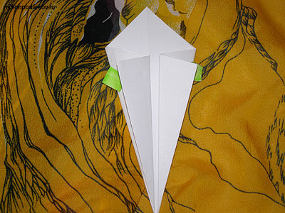Переворачиваем нашу заготовку. Верхний угол делим на три части и заворачиваем обе стороны с небольшим захлестом на среднюю линию