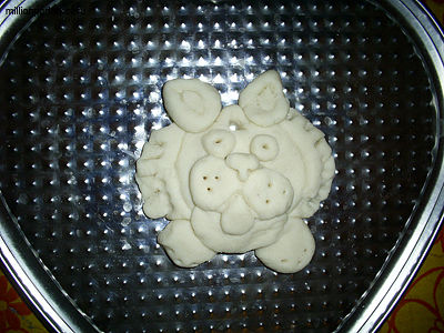Теперь приступаем к самому процессу лепки. Делать поделку лучше всего прямо на противне или подставке, где в последствии она и будет сушиться. Мы сделали голову тигра с лапками. Мелкие детали удобно делать с помощью зубочистки. Не забудьте сделать отверстие для петельки из тесемки.