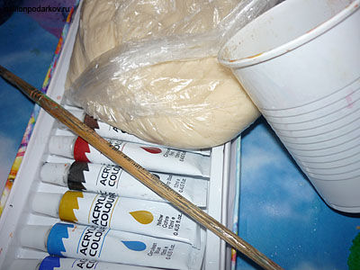 Для того, чтобы у нас получились Смешарики из соленого теста необходимо замесить это самое соленое тесто. Для этого берем 2 столовые ложки муки и 2 столовые ложки соли мелкого помола, добавляем немного воды. Замешиваем крутое соленое тесто, по консистенции, примерно, как на пельмени. Ставим тесто в холодильник на пару часиков, а потом лепим. Раскрашивать поделку будем акриловыми красками, с помощью кисточки и стакана с водой. Еще нам потребуется магнит и клей "Момент".