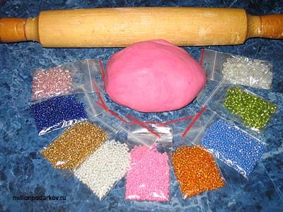 Нам необходимо приготовить соленое тесто, окрасить его в розовый цвет с помощью розовой гуаши. В работе потребуются бисер, клей ПВА, клей ПВА, стеки.