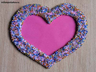 Клей ПВА разводим 1:1 с водой. Кисточкой смазываем небольшой участок сердца и плотно укладываем на клей бисер в любом сочетании цветов. Покрыть бисером все все сердце. Основой для рамки может служить розовая цветная бумага.