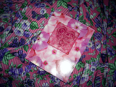 Складываем лист картона с цветочным рисунком пополам, отрезаем половину и складываем ее еще раз вдвое. Приклеиваем квадратик с декупажем. Вот такая открытка у нас получилась в итоге.