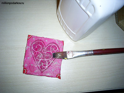 Приклеиваем салфетку к квадратику клеем ПВА, разбавленным водой. Кисточкой проглаживаем сверху от середины к краям, убирая морщинки. Когда высохнет, покрываем лаком.
